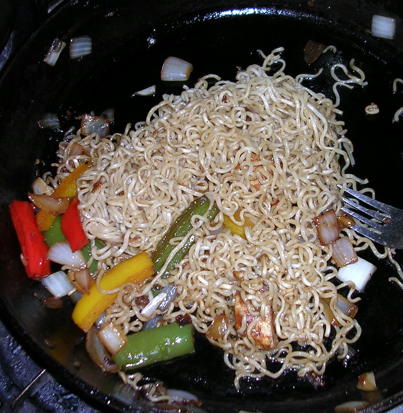 Of course, like every other recipe, you can substitute what you have. Ham cubes instead of chicken, maybe, or some other pasta for the ramen if you have it. If you don’t use the seasoning packet, the salt and soy will probably need to be upped instead, or add more garlic or ginger. If you have canned bamboo shoots or baby corn or fresh pea pods or any other of a host of other veggies, throw them in instead.